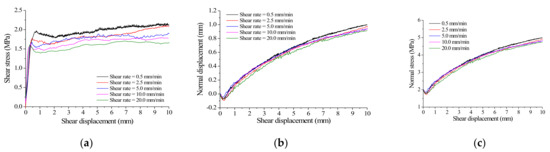 The stress and displacement curves of joint shear under diverse shear rates are displayed in Figure 8. With the rise of the shear rate, the shear stress bend of joints gradually moves downward, indicating that the larger the shear rate is, the shear strength of joints gradually decreases. This is mainly due to the joint surface roughness deformation failure and the different contact forces caused by it. When the shear rate is small, there are more time transfer forces in the shear process of the joint, which can fully mobilize the shear performance of the joint. However, when the shear rate is large, the shear process time is short, and the force is mainly concentrated on the part of the rough body that fails to transfer in time. The shear stress curve under different rates has the same trend of change, which is also divided into three stages, that is, within a small shear displacement (0.372–0.74 mm), the shear stress rapidly rises to the peak, after the peak, the shear stress decreases slightly, and then rises steadily. However, the corresponding shear displacement range of each stage of the shear stress curve is different with different shear rates. With the rise of the shear rate, the range of stage Ⅰ is smaller; that is, the corresponding peak shear displacement is smaller. This is mainly caused by the decrease of joint peak strength and shear stiffness with the rise of shear rate [39]. In the Ⅱ stage, the smaller the shear rate is the slower the shear stress curve of the joint drops, which indicates that the smaller the shear rate is in this stage, the less the surface roughness failure of the same shear displacement. Then, under the action of constant normal stiffness, the shear stress gradually rises, and when the shear displacement is greater than 7 mm, the slope of the five shear stress curves under different shear rates is similar, but when the shear displacement is greater than 7 mm, the shear stress curves with shear rates of 5.0, 10.0 and 20.0 mm/min gradually flatten out. The shear stress of joints basically no longer rises, while the shear stress curves continue to rise when the shear rate is 0.5 and 2.5 mm/min, which again confirms the view that the greater the shear rate, the more serious the roughness failure of the surface.