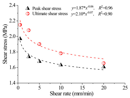 The peak shear stress and final shear stress of joints under different shear rates were counted in Figure 9. The peak shear stress, final shear stress, and shear rate of the joint are obviously power functions (the exponent is negative). When the shear rate is between 0.5 mm/min and 5 mm/min, the peak shear stress and final shear stress falling rate of the joint are much higher than those when the shear rate is between 5 mm/min. This result is consistent with that of Atapour et al. [31], Tang et al. [32], and Wang et al. [33]. This indicates that when the shear rate reaches a certain value, its effect on the shear strength of the joint is no longer significant.