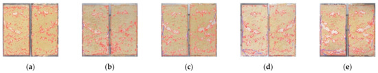 Failure modes of joints under diverse normal stiffness status. (a) For kn = 0; (b) For kn = 1 MPa/mm; (c) For kn = 3 MPa/mm; (d) For kn = 5 MPa/mm; (e) For kn = 7 MPa/mm.