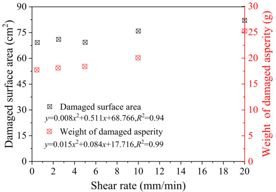 Damaged surface area and weight of the damaged asperity of the joint surface under diverse shear rates.