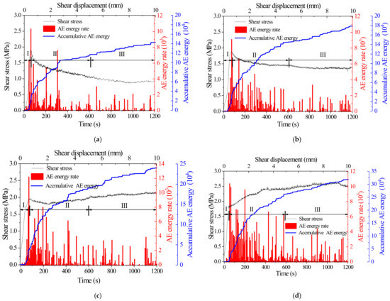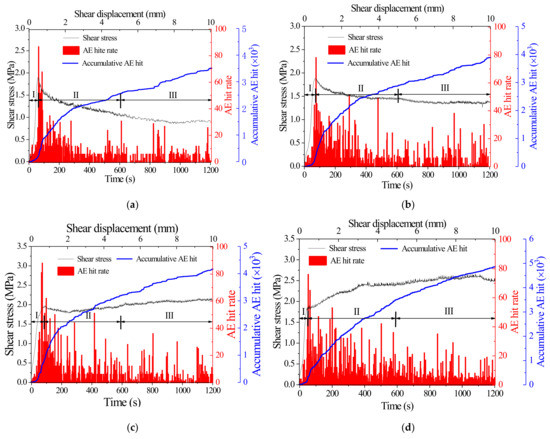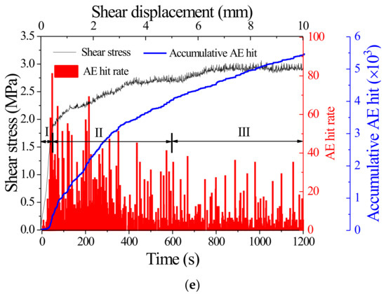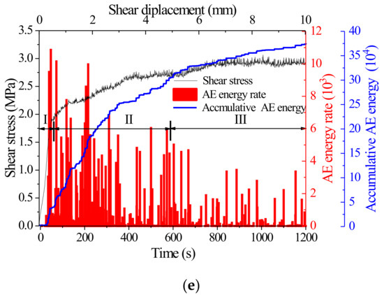 During joint shearing, the source of AE signals mainly comes from asperity degradation, including the breaking, rolling, squashing, and moving of asperities on the joint surface. Figure 12 and Figure 13 show the evolution of AE signals and the accumulative AE signals for joints undergoing shear under various normal stiffness, respectively. The AE energy is defined as the area enclosed by the signal envelope (unit of voltage is mv) and axial of abscissas (unit of time is us), which represents the relative intensity of AE signals. In the pre-peak stage (Stage I), the AE signals are relatively quiet at the initial shear stage (approximately 0.7 times the peak shear displacement) due to the elastic deformation of asperities. In this phase, the accumulative AE energy is almost negligible. With the further increase of shear displacement, the AE impact signal increases rapidly and peak at the maximum shear stress. This is because when the shear stress reaches the peak, the surface roughness of the structural plane is chewed off in a large number of moments. Then, as the shear continued, the acoustic emission impact signal began to decline in the Ⅱ stage. However, the acoustic emission impact signal remained at a high level because there were still rough bodies on the surface of the structural plane at this stage. Finally, in the Ⅲ stage, there is almost no nibbling failure on the surface of the structural plane, and the AE impact signal is generated by the friction of the structural surface, so the AE impact signal is maintained at a low level. It must be noted that in the post-peak stage, there are still relatively high values of AE impact signals, which may be caused by the secondary crushing of some nibbled bulges. These results are consistent with those of Meng [12] and Wang et al. [33].