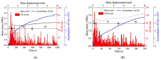 Figure 14 and Figure 15 show the acoustic emission signals during the shear process of the structural plane under the condition of normal stiffness of 3 MPa/mm and a shear rate of 0.5–20 mm/min. Under different shear rate conditions, AE signals have the same variation trend, but the data volume of AE signals is different; that is, the AE signal histogram with a small shear rate is finer and denser, while the AE signal histogram with a large shear rate is thicker and thinner. This is because the shear rate is different and the shear time is different, resulting in different amounts of AE data monitored. When the shear rate is high (10–20 mm/min), the loudest emission energy appears after the shear stress peak, and the AE energy exceeds 103 more times, which is mainly because the rough structure of the structural plane is broken in large pieces and more local cracks occur at the high shear rate. The AE hit rate and energy rate trends rise with a rise in shear rate, which indicates a larger energy release of the joint when the shear rate is large. This conclusion shows agreement with the observation of Meng et al. [12].