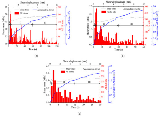 Difference of AE hit rate and cumulative AE hit of joints under diverse normal stiffness status. (a) For kn = 0; (b) For kn = 1 MPa/mm; (c) For kn = 3 MPa/mm; (d) For kn = 5 MPa/mm; (e) For kn = 7 MPa/mm.
