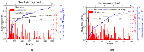 - When the shear rate is low (0.5~5 mm/min), the accumulated AE energy increases from 239,235 to 362,421 with the increase of shear rate; when the shear rate is high (5~20 mm/min), the accumulated AE energy decreases from 362,421 to 241,423 with the increase of shear rate.