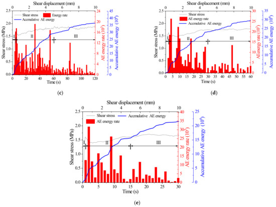 Difference of AE energy rate and amassed AE energy of joints under diverse normal stiffness status. (a) For kn = 0; (b) For kn = 1 MPa/mm; (c) For kn = 3 MPa/mm; (d) For kn = 5 MPa/mm; (e) For kn = 7 MPa/mm.
