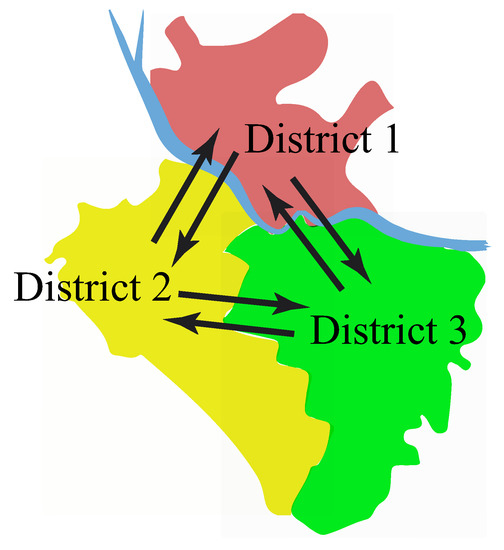 Schematic representation of a territory with interacting districts.