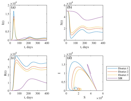 The dynamics of Equation (1) were identical for districts 2 and 3. The number of infected individuals demonstrated a big first wave in the time period from 20 to 30 days, with a recovery period from 30 to 40 days and a second lower wave from 30 to 50. Initially, infected district 1 demonstrated the maximal value of infected in the first wave, while the second and third districts were only slightly lower due to the high interaction within each district.
