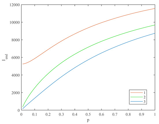 The final number of infected demonstrates a slow upward slope on the dependence of the final number of infected in districts (red—1, green—2, blue—3) on the degree of openness of the boundaries between the hub and other districts, as shown in Figure 4. The numerical simulation showed that despite differences in infection probability, the final number of infected is quite similar. For the very low values of p (), differences between the hub and rural districts are sufficient (more than 10 times) as the graphs demonstrate upward growth. However, for the values , the final number of infected in the hub area is only twice as large for for the and districts and keeps diminishing with the degree of openness of the boundaries between the hub and other districts. With a sufficiently large degree of openness, the whole city could be seen as one homogenous entity.