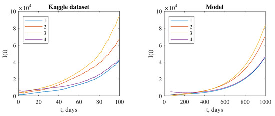 The dynamics of the infection cases in the prefectures and districts (Tokushima—1, Kagawa—2, Ehime—3, Kochi—4) for the Kaggle dataset and model data with the parameters n = , , , , , .