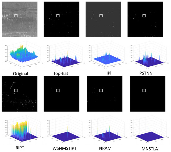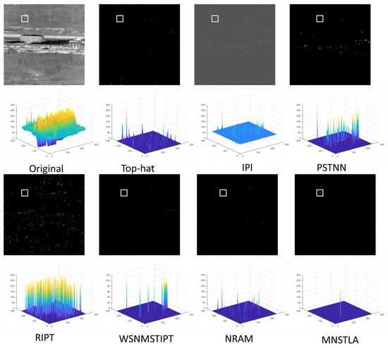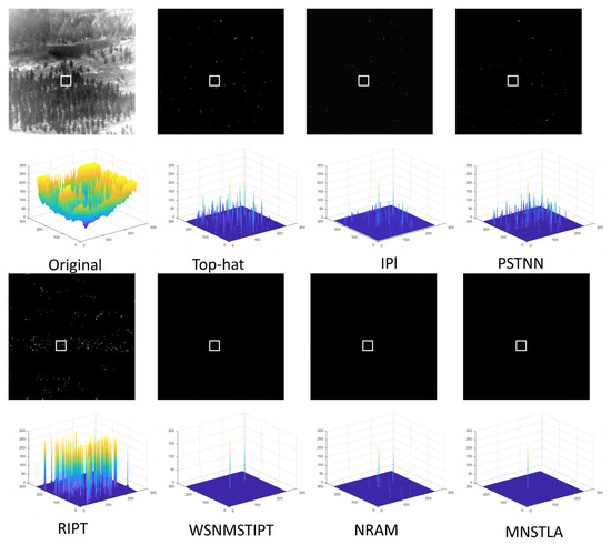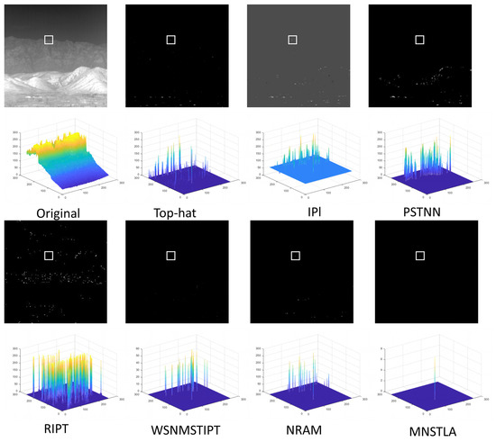 In this sub-section, we give the detection results of six infrared image sequences. The method proposed herein is compared with six related advanced methods, namely Top-Hat [41], IPI [9], PSTNN [22], IPT [23], WSNMSTIPT [24], and NRAM [16]. For the convenience of observing the results, the experimental results obtained and the three-dimensional grid diagrams generated by all the test methods in different scenarios are given intuitively in Figure 5, Figure 6, Figure 7, Figure 8, Figure 9 and Figure 10.