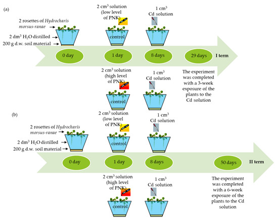Scheme of the experiment with a European frogbit (a) a 3-week exposure of the plants to the Cd solution (I term); (b) a 6-week exposure of the plants to the Cd solution (II term); four replications in each from three growing seasons, Σ12 replications.