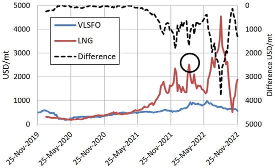 The life-cycle cost assessment must be considered when evaluating the use of alternative fuels, along with the environmental aspects. Although based on one example of a 1500 TEU container ship, it is concluded in [] that, in general, LNG-fuelled ships have higher running Operational Expenses (OPEX) and lower Voyage Expenses (VOYEX). A point must be considered the loss of cargo space due to installing LNG tanks onboard.