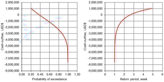 Cash-outflow return value (right) vs. probability of exceedance (left) and return period (right).