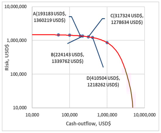 The financial risk for the four analysed scenarios estimated as a function of the cash outflow is defined as A (1,360,219 USD$), B (1,339,762 USD$), C (1,278,634 USD$) and D (121,826 USD$), as can be seen from Figure 7.