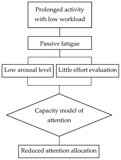 Physiological and behavioral changes accompanied by passive fatigue are highly related to the allocation of attention [13]. As the capacity model of attention implies, attention allocation is determined by individual’s current arousal level, evaluation of demands on capacity, enduring dispositions, as well as momentary intentions when engaging in a specific task [13]. When experiencing passive fatigue, reduced arousal level and low task requirements would decrease individuals’ intention to exert effort on the current task, which further leads to a reduction in attention allocation and task performance standards [12] (see Figure 1).