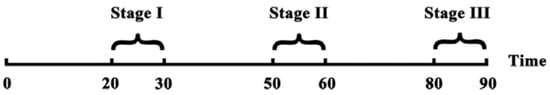 This experiment adopted a one-way repeated measures design, with time serving as the independent variable. Previous studies indicated that drivers became fatigued or reduced task engagement levels after about 30 min of driving [23], and a 90-min driving experiment could induce driver fatigue [24]. Therefore, the current study adopted a 90-min driving task, which was further divided into three segments of 30 min. As the experiment protocol suggested that every fatigue score represented drivers’ fatigue status for the past 10 min, all data in the last 10 min of each segment were comprised of the final dataset [25] (see Figure 3). Furthermore, according to Antonson, Mårdh, Wiklund, and Blomqvist (2009), participants driving in the open landscape experienced less stress and did not consume many cognitive resources [26], which was a low workload driving condition and was easy to induce passive fatigue driving experience. Therefore, the present study set the experimental scenario as an open, monotonous highway in order to induce passive fatigue for the participants.