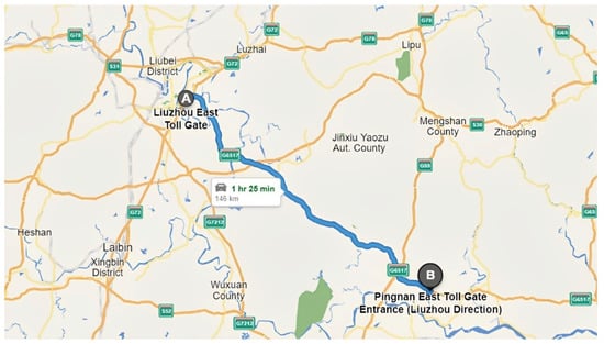 Driving route (Note: Point A represents Liuzhou East Toll Station, and point B represents Pingnan East toll station).