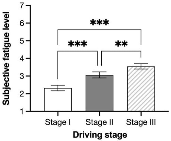 As shown in Figure 7, the level of subjective fatigue increased over time as the driving task proceeded. The repeated measures using ANOVA and the subsequent post hoc test indicated that there was a significant change among the three driving stages, F(2, 62) = 33.63, p < 0.001, η = 0.52. The subjective fatigue level was higher in stage III than in stage I (t(31) = 8.14, p < 0.001, Cohen’s d = 1.44) and stage II (t(31) = 3.21, p < 0.01, Cohen’s d = 0.57), and higher in stage II than in stage I (t(31) = 4.93, p < 0.001, Cohen’s d = 0.87). The mean and standard deviation of fatigue levels at each stage are presented in Table 4.