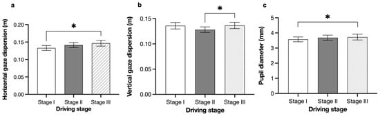 Eye tracking indicators under three driving stages. (Note: (a) represented analysis of drivers’ horizontal gaze dispersion; (b) represented analysis of drivers’ vertical gaze dispersion; (c) represented analysis of drivers’ Pupil diameters. A single asterisk (*) indicates significance at p < 0.05).