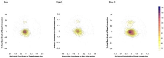 Significant differences have also been reported in drivers’ vertical gaze dispersion, F(2, 62) = 4.24, p < 0.05, η = 0.12 (see Figure 8b). The post hoc test indicated that a broader vertical gaze dispersion appeared in stage III than in stage II, t(31) = 2.60, p < 0.05, Cohen’s d = 0.46. The density contour plots based on the intersection coordinates of three-dimensional gaze direction and vertical plain z = 0.9 in Figure 9 further visualize these tendencies.