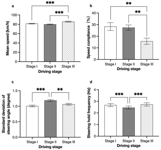 Vehicle dynamics under three driving stages. (Note: (a) represented analysis of drivers’ mean speed; (b) represented analysis of drivers’ speed compliance; (c) represented analysis of drivers’ the standard deviation of steering angle; (d) represented analysis of drivers’ steering hold frequency. Two asterisks (**) indicate p < 0.01, and three (***) indicate p < 0.001).