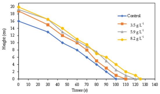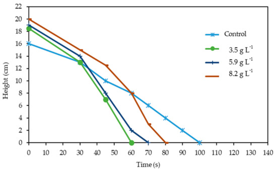 After the jar test assays, the settling kinetics of the flakes was analyzed by observing the flakes settling over time in a measuring cylinder. Figure 2 and Figure 3 represent the height of the flakes over time in these assays for each acid and alkaline coagulant dosage, respectively. In both figures, the control corresponds to the assay without coagulant.