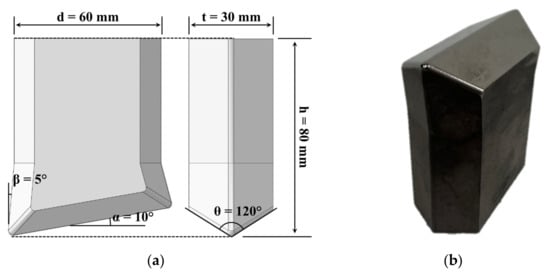 The shape of the cutting tool used in this study was obtained from a previous work [21]. The specifications of the cutting tool are shown in Figure 2a. The length (h), thickness (t), and width (d) were 80, 30, and 60 mm, respectively. The edge angle (θ), clearance angle (α) and rake angle (β) were 120°, 10° and 5°, respectively. This tool was manufactured using SKD 11 alloy steel with a hardness greater than 60 HRC to reduce tool wear. Moreover, the edge in contact with the rock was filled to a radius of 2 mm. Its actual appearance is shown in Figure 2b.