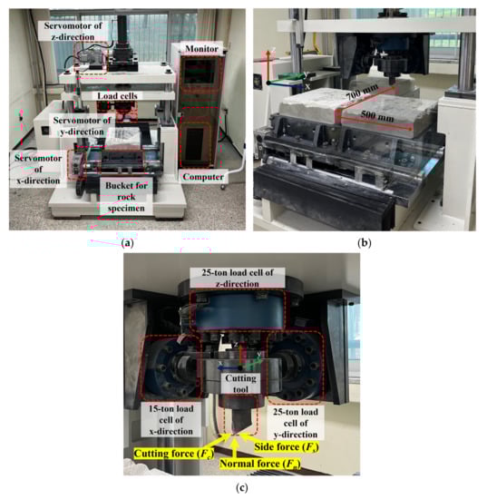 In this study, rock-cutting tests were performed using a small-scale linear cutting machine, as shown in Figure 4a. A linear cutting machine is divided into cutting and control systems. The cutting system includes a frame of the main body, bucket for holding rocks, driving device for a machine, and load cells. The control system consists of a computer and monitor.