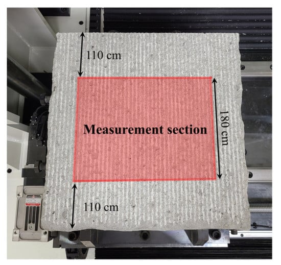 The main cutting tests were performed using penetration depths of 3, 6, and 9 mm; the spacings used for each penetration depth are listed in Table 2. Because the cutting speed does not affect the cutting performance [29], it was arbitrarily set to 12.5 mm/s. The cutting test consisted of five cuts. Rock fragments and tool forces were used only from the measurement area in Figure 5, and the results from the first cut were excluded from the analysis because they did not represent an interaction between the cuts.