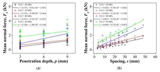 The variations In the mean normal force with penetration depth and spacing are shown in Figure 6 for all rock specimens, and the details are listed in Table 3, Table 4, Table 5 and Table 6. The normal force in cutting with the tool of the pre-cutting machine increased linearly as the penetration depth increased. The increase in the spacing also increased the normal force and formed a linear relationship. However, the correlation with the spacing (R2 > 0.602) was stronger than that with the penetration depth (R2 < 0.587). This indicates that the spacing affects the normal force more than the penetration depth.