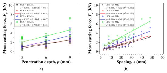 The variations in the mean cutting force with penetration depth and spacing are shown in Figure 7 for all rock specimens, and the details are listed in Table 3, Table 4, Table 5 and Table 6. When the pre-cutting machine tool is used, the cutting force increased linearly with penetration depth and spacing. In addition, the cutting force, similar to the normal force, was influenced more by the spacing than the penetration depth.