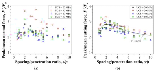 The ratio of peak-to-mean tool forces is an important factor in the design of machines and cutting tools. This ratio affects the vibration of the cutting head and breakdown of the mechanical parts. Machine vibrations generally increase as the ratio increases [29]. Considering that the ratio of the peak to mean tool forces does not correlate with the penetration depth [35], the relationship with the s/p ratio was analyzed in this study.