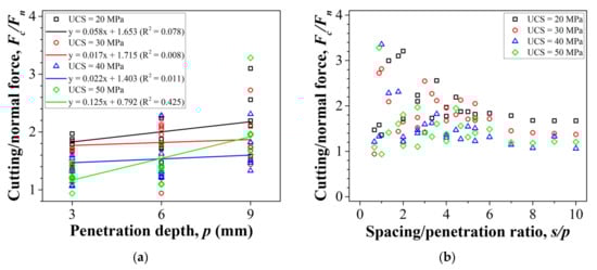 The relationship between the ratio of the cutting and normal forces and the penetration depth is shown in Figure 9a. Regardless of the rock strength, the ratio of the cutting to normal force and penetration depth formed a positive linear relationship. However, except for USC 50 MPa (R2 = 0.425), the correlation was weaker (R2 < 0.08). It can be predicted that this ratio is not significantly affected by the penetration depth during the cutting action by the precutting machine.