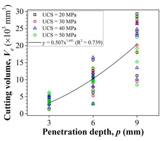 Figure 10 shows the relationship between the penetration depth and cutting volume for all rock specimens. Bilgin [37] reported that the cutting volume of a disc cutter increases exponentially as the penetration depth increases. Yasar and Yilmaz [20] reported that the cutting volume forms a power function relationship with the penetration depth during cutting by a pick cutter. In this study, the cutting volume increased within the power function relationship as the penetration depth increased, regardless of rock strength. In addition, the cutting volume was not affected by the rock strength.