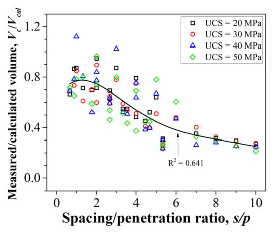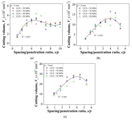 Yasar and Yilmaz [20] reported that the cutting volume reaches a maximum at the optimal s/p when using a pick cutter. Furthermore, the optimal s/p did not exhibit a relationship with the strength of the rock. The same result was confirmed in cutting using the cutting tool of the precutting machine. The variation in the cutting volume with s/p ratio is shown in Figure 11. The cutting volume reached a maximum at a certain spacing, and then decreased. It should be noted that the optimal s/p at which the cutting volume reaches the maximum is the same, regardless of the penetration depth.