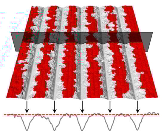 When cutting with a constant penetration depth, the rock between the cutting lines is completely removed up to the optimal spacing. However, if the spacing becomes larger than the optimal value, the rock between the cutting lines is not completely removed. If a ridge is formed between the cutting grooves, the cutting tool and cutter head of the tunnel excavation machine can be damaged [32]. Therefore, the characteristics of ridge formation during cutting using a pre-cutting machine were analyzed. The analysis was performed only on the rock specimen with a UCS of 20 MPa, and the cross-sectional profile was obtained by projecting a straight line onto the center of the damaged rock surface, as shown in Figure 13. The red part indicates the undamaged rock surface, and the gray part indicates the grooves generated from cutting.