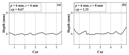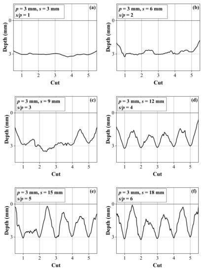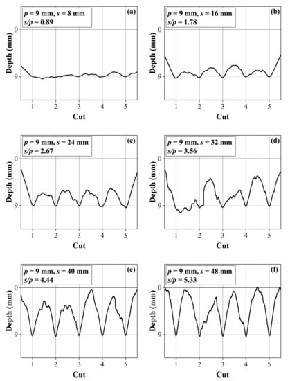The cutting volume reached a maximum of approximately 5000 mm3 when the s/p ratio was 4 during cutting with a penetration depth of 3 mm (Figure 11a). Even when cutting with penetration depths of 6 mm and 9 mm, the cutting volume reached maximum values of approximately 13,000 mm3 and 28,000 mm3, respectively, with an s/p ratio of 4 (Figure 11b,c). Furthermore, when s/p exceeded 8 at a penetration depth of 3 mm, the cutting volume was constant at approximately 4000 mm3 (Figure 11a). This result indicates that when s/p becomes larger than 8, it is cut in the unrelieved mode, where the interaction between cutting does not occur. The details of the cutting volumes are listed in Table 3, Table 4, Table 5 and Table 6.