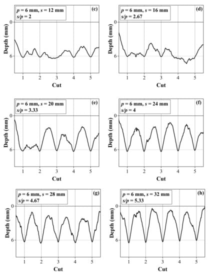 Figure 14, Figure 15 and Figure 16 show that the height of the ridges rise with increasing spacing. In particular, ridge formation began when the cutting spacing was 6 mm with a penetration depth of 3 mm (Figure 14b). Moreover, in cutting with penetration depths of 6 mm and 9 mm, ridge formation began when the spacing was 8 mm and 16 mm, respectively (Figure 15b and Figure 16b). This result supports the fact that the ridges are generated between the cutting grooves when the spacing exceeds 1.5 times the penetration depth, as mentioned in Section 3.2.3. In addition, the ridge reached the height of the rock surface before cutting, when the penetration depth and spacing were cut to 3 mm and 24 mm, respectively (Figure 14h). This result proves that from the case that s/p is 8, cutting is performed in an unrelieved mode in which no interaction occurs between cuts, as mentioned in Section 3.2.2.