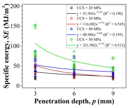 Figure 17 shows the relationships between the specific energy and penetration depth obtained from cutting using the pre-cutting machine cutting tool. At the same penetration depth, the greater the rock strength, the greater the specific energy. In addition, in all the rock specimens, the specific energy and penetration depth formed a power-function relationship. These results show that the effect of penetration depth on the specific energy of the pre-cutting machine is the same for other excavation machines. The details of the specific energy according to the penetration depth are listed in Table 8.