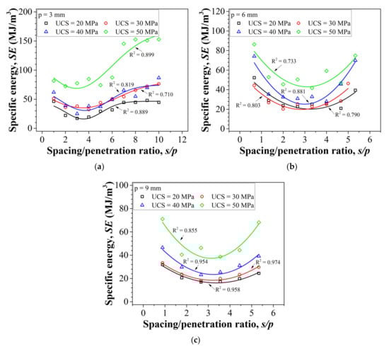 The relationships between the s/p ratio and specific energy obtained in this study are shown in Figure 18. In the rock specimen of USC 50 Mpa, the optimal s/p was 2.94 for cutting with a penetration depth of 3 mm, and 3.11 and 3.14 for penetration depths of 6 mm and 9 mm, respectively (Table 9). The optimal s/p ratio at which the specific energy was minimized was almost the same, regardless of the penetration depth. For the other rock specimens, the optimal s/p value was between 2 and 4, regardless of the penetration depth. This was consistent with several studies in which the optimal s/p ratio of the pick cutter of the roadheader ranged from 2 to 5 [13,14,19,27]. Therefore, it can be expected that the cutting tool of the pre-cutting is similar to that of the pick cutter. The details of the specific energy according to spacing are listed in Table 8. The optimal s/p ratio and the minimum specific energy are presented in Table 9.