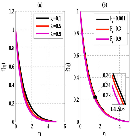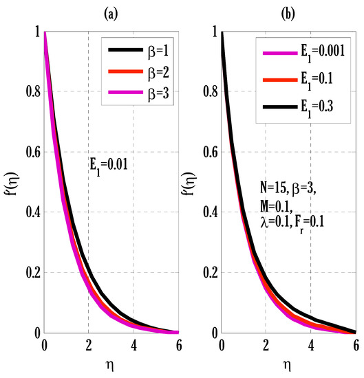 where is the magnetic parameter, is electric field parameter, permeability of the porous medium, is the Forchheimer number, is the Prandtl number, is Eckert’s number, is the Brownian motion variable, is the thermophoresis variable, is the radiation parameter, is the Schmidt number, and is the reaction rate, and these are defined as