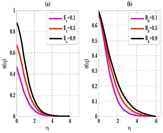 Figure 4 displays the effect of the Eckert number and radiation parameters on the temperature profile. Growth in both parameters offers enhancement in the temperature profile. Since friction between fluid particles rises due to escalation in the Eckert number and heat flux also rises due to incoming radiations, this increases the temperature profile. Figure 5 shows the temperature profile with a variation of the Brownian motion parameter and Biot number, that is, temperature profile augmentations by incrementing the Brownian motion parameter and Biot number. Since the escalation of random movement of particles spreads the hot particles in the plate’s vicinity, this leads to temperature profile growth.