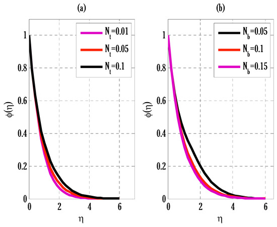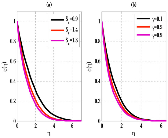 The effect of thermophoresis and Brownian motion parameters on the concentration profile is depicted in Figure 6. The concentration profile grows and declines by, respectively, rising thermophoresis and Brownian motion parameters. The rise in thermophoresis forces transfers particles from the plate to its vicinity, leading to a rise in the concentration profile. The variation of the Schmidt number and reaction rate parameters on the concentration profile is displayed in Figure 7. By looking at this Figure 7, it can be deduced that the concentration profile decays by escalating the Schmidt number and reaction rate parameter. The decay in the concentration profile due to the increment in the Schmidt number is the consequence of the decline in the mass diffusivity that slows down the diffusion process, resulting in a decline in the concentration profile. The enhancement in the reaction rate parameter produces breaking and forming of new substances, which slows down the concentration profile.