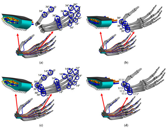 Boundary condition for all cases. (a) finger flexion, (b) wrist extension, (c) wrist extension and subsequent fingers flexion, (d) wrist flexion.