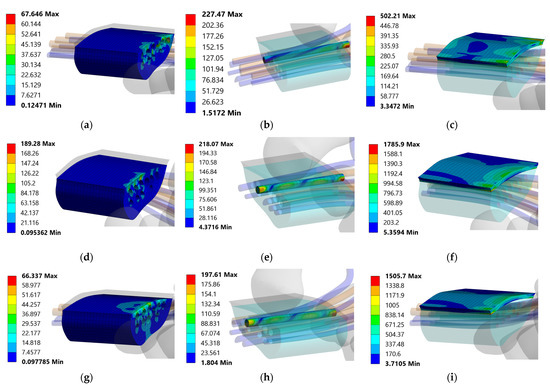 Stress [Pa] (a) SSCT with fingers flexion, (b) median nerve with fingers flexion, (c) transverse ligament with fingers flexion, (d) SSCT with wrist extension, (e) median nerve with wrist extension, (f) transverse ligament with wrist extension, (g) SSCT with wrist flexion, (h) median nerve with wrist flexion, (i) transverse ligament with wrist flexion.