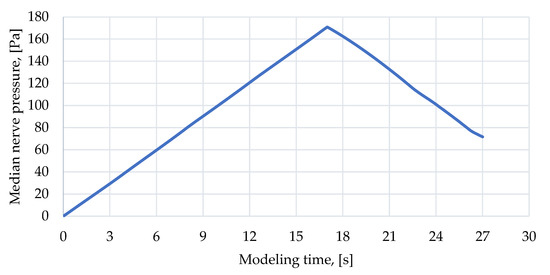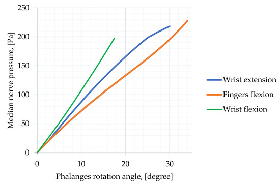 The observed pressure on the median nerve decreased in the two-step simulation (Figure 5, case 3) indicating opposite loading areas during wrist extension and finger flexion sequences. It is assumed that with an increase in the phalangeal angle of finger flexion after a slight decrease, the compression will further increase. However, the existence of movements that reduce median nerve compression can help to create simulators and exercises for decompression.