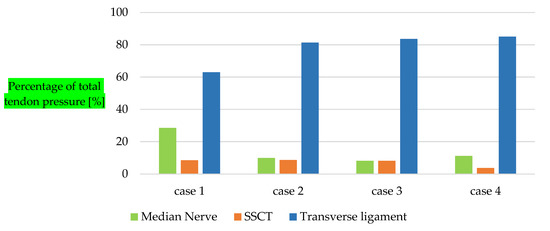 Investigated finger and hand movements caused pressure in the carpal tunnel, median nerve, and transverse ligament. The main cause of pressure was the movement of tendons in the soft tissue of the carpal tunnel. The movement of the tendons is like an external load for the carpal tunnel system. The external load caused by the tendons is distributed to the surrounding tissues. Obviously, tighter fabrics take most of the load, but to know how much, it is necessary to make a calculation. Figure 6 shows the percentage pressure distribution over the median nerve, transverse ligament, and SSCT. The histogram shows the relative pressure distribution, where 100% is the total load of all three objects. It can be seen that during finger flexion (case 1) the median nerve takes almost 30% of the total load, when in other cases this figure is at the level of 10%. At the same time, the transverse ligament takes more than 80% of the load during flexion/extension of the wrist. This suggests that when the wrist is flexed/extended, the transverse ligament takes the mechanical load first and the median nerve takes the mechanical load when the fingers are flexed.