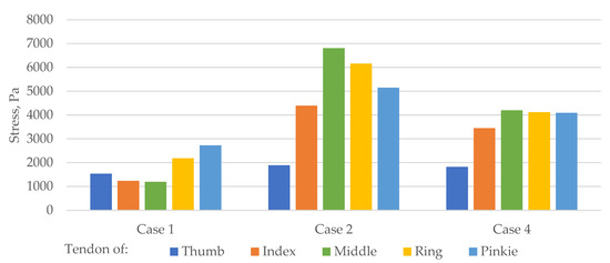 The comparison of tendon movement with external loading for the carpal tunnel system was uneven because each tendon has its own unique shape and location in the area of the carpal tunnel. Each finger has two flexor tendons, except for the thumb, which has one. Among the two tendons for each finger, maximum tension was taken and is shown for cases 1, 2, and 4 in Figure 7.