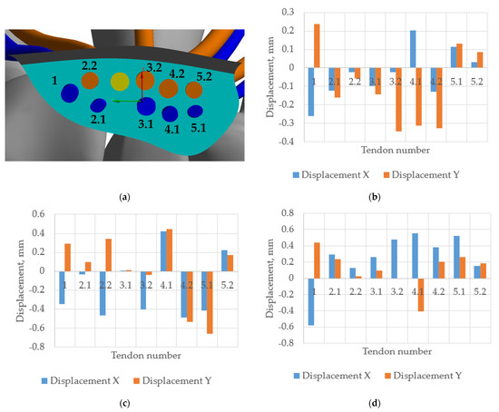 The superficial and deep tendons passing through the carpal tunnel are stretched by the corresponding muscles and have mobility in the transverse section of the carpal tunnel. The X and Y directional displacement with respect to the coordinate system (Figure 8a) of the finger flexor tendons were obtained. In Figure 8b–d, blue shows movements relative to the X-axis, and orange shows movements relative to the Y-axis. The coordinate system is in the geometric center of the carpal tunnel, with the X-axis pointing toward the transverse ligament, the Y-axis pointing perpendicular to it, and the Z-axis pointing toward the flexor muscles. The largest tendon displacements were seen during hand flexion (Figure 8d) (case 4).