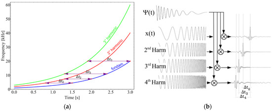 This property is depicted in Figure 2 and is the basis of the Hammerstein model identification procedure described in [16,17,18,19]. In the particular case where the signal used for pulse compression is a swept sine of the exponential type and if, in addition, the instantaneous phase of the input signal respects some specific constraints, as described in [27], the compression filter, which is characterized by a frequency trend as a function of time that is exactly the same as that of the excitation swept-sine signal, fits not only with the input signal at instant , but also at instants with its harmonics of order k produced by the nonlinear system.